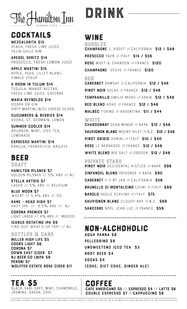 The Hamilton Inn Menu In Jersey City New Jersey Usa
